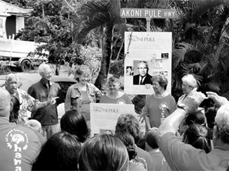 Herring Kalua, far left, leads the dedication of the marker honoring Akoni Pule on July 7. Kalua is joined by, left to right, NKCRC executive director Christine Richardson, board member Bob Martin, and Sarah Pule-Fujii, Lena Kapeliela and Margaret Kaoo, daughters of